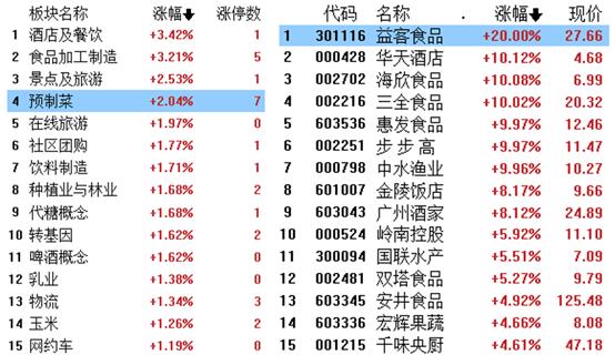 仅看今天,大市惨绿,预制菜板块却逆势上涨2.04%,益客食品、华天酒店、海欣食品等7股涨停,板块涨停率位居概念榜首。