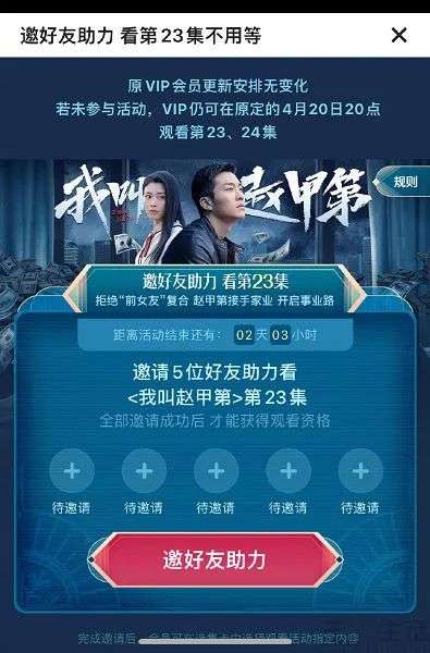 不难发现,优酷此举是希望通过《我叫赵甲第》这样一部有热度的剧集,来实现用户量、特别是付费用户的增长。优酷的策略也很简单,热门剧集一向是视频网站实现付费会员增长的关键所在,但这种增长通常靠的是在其他平台上的广告投放,以及观众“自来水”引发热议,但这两种方式如今的效果已经越来越有限,显然邀请好友助力就成为了一个获得用户增长的法宝。