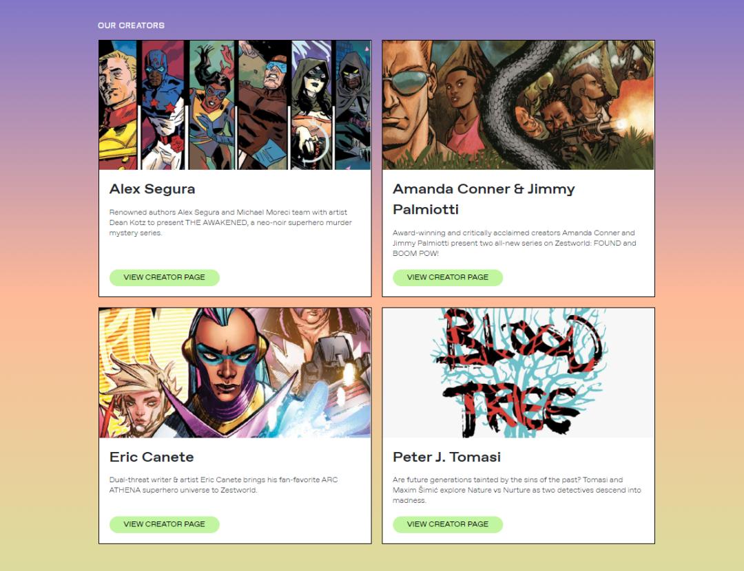 「Zestworld」这边目前没有上线移动端的应用,不过此前「Zestworld」官宣了 Amanda Conner, Jimmy Palmiotti, Peter J. Tomasi, Eric Canete, Phil Jimenez and Alex Segura. A 在内的一批人气创作者的加盟,应该能为「Zestworld」带来不少人气。另根据 TechCrunch 的报道,「Zestworld」在未来还计划加入社区管理、NFT/元宇宙相关功能。