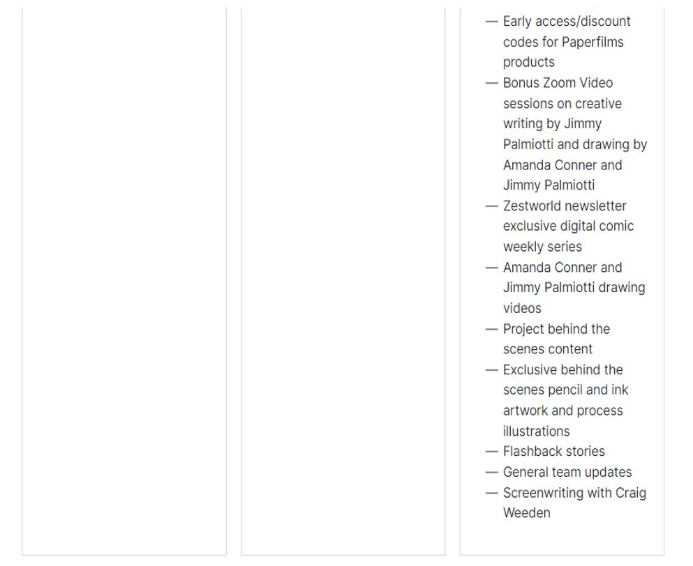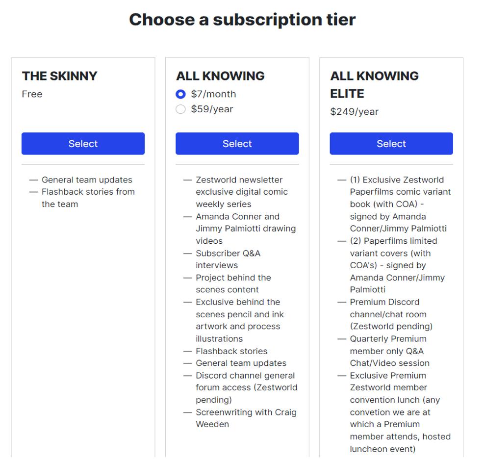 「Zestworld」,本质上还是一个漫画平台,但打开其官网能够看到,官网的构建是以创作者为中心的,而非以内容为中心。因此,公司也自称「Zestworld」是一个创作者驱动的漫画平台。具体表现上,创作者可以自行设计付费方案的价格、权益。以一位名为 Amanda Conner & Jimmy Palmiotti 的创作者为例,在其最高价位一档的权益包中,订阅者有机会拿到漫画家的亲笔签名之外,还有机会加入仅限季度高级会员的 QA 活动、参与漫画家组织的视频会议等活动。上述机制很容易让人想起「Patreon」 、「Substack」等平台的订阅机制,区别似乎只在于「Zestworld」在专注打造一个漫画的平台,不过另据 TechCrunch 报道,「Zestworld」为漫画家打造了一个配套的 IP 管理工具,但在官网上暂时还没看到有关这项业务的更多介绍。