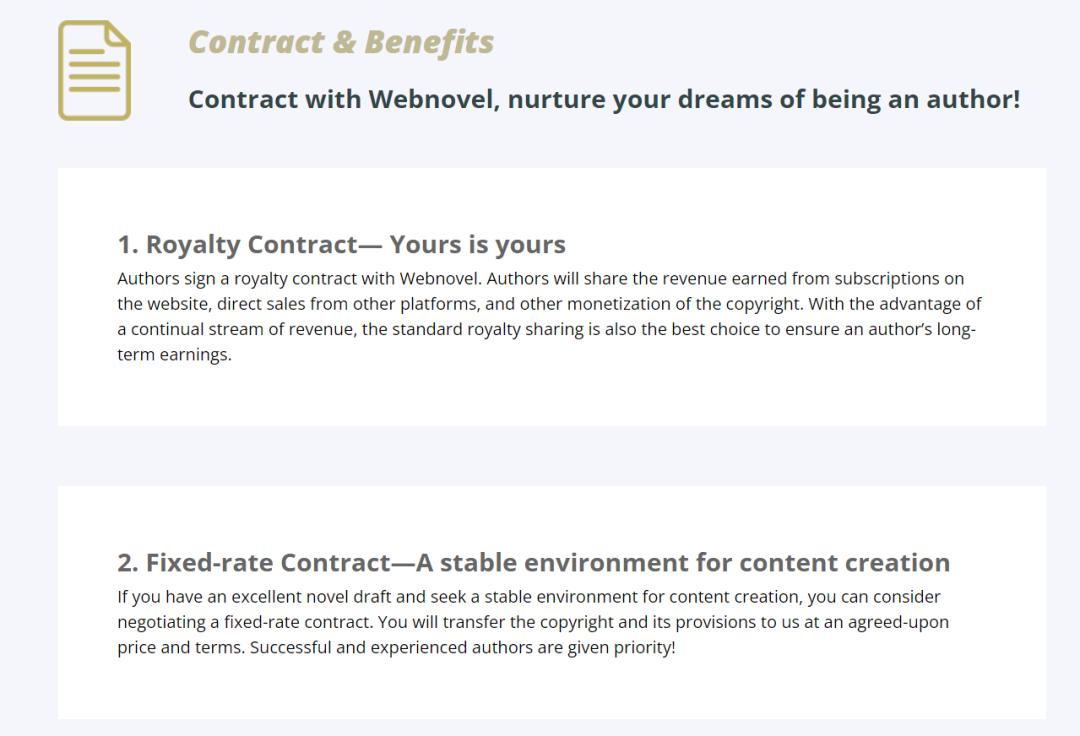 关于「Webnovel」到底以怎样的条款和创作者合作,笔者特意去官网上搜索了一番,找到了目前「Webnovel」为作者提供两个版本的合同,一是版税合同,作者可以从网站/App 订阅收入、其他平台的直接销售收入以及其它版权的变现中获取长期收益;第二种是固定费率合同,也就是买断合同,签署后作者失去版权,好处是拥有一笔直接收益可以保证他们安心创作,当然,经验丰富的作者拥有达成这类合作的优先权。至少从官网的描述来看,「Webnovel」的合作方式算是公平公开。