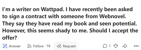 提问者说自己原本在「Wattpad」(来自加拿大的在线阅读平台,据 apptopia 数据,其也是 2021 年上半年全球下载量第 1 的网文 App)上写小说,突然收到了「Webnovel」的合作邀约,想咨询一下各位网友是否要接受。热评第一来自一位出版作者,她提醒这位网友,与「Webnovel」签约的作者将失去未来书籍出版、影视改编等带来的收益,最后还不忘以自己的圈子做论据,她写道“我认识的作者都不会在这一点上做妥协”。