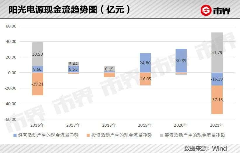 这意味着,从现金流的角度来看,2021年阳光电源不仅没有赚到钱,还花了16.39亿元。