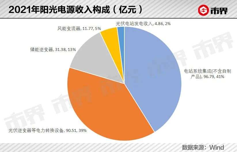 2021年,其收入主要来自电站系统集成业务,光伏逆变器等电力转换设备业务,以及储能逆变器业务,三个板块收入分别为96.79亿元、90.51亿元和31.38亿元,另有少部分风能逆变器和光伏电站发电收入。