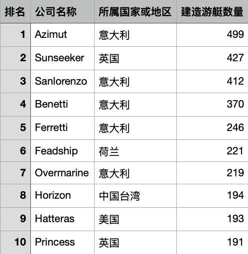 很明显,意大利是超级游艇制造大国,其中排名第一的Azimut和排名第四的Benetti实际上属于一家企业。如果有读者想跟随国内KOL的脚步购买超级游艇,不妨看看英国Sunseeker和意大利Ferretti。