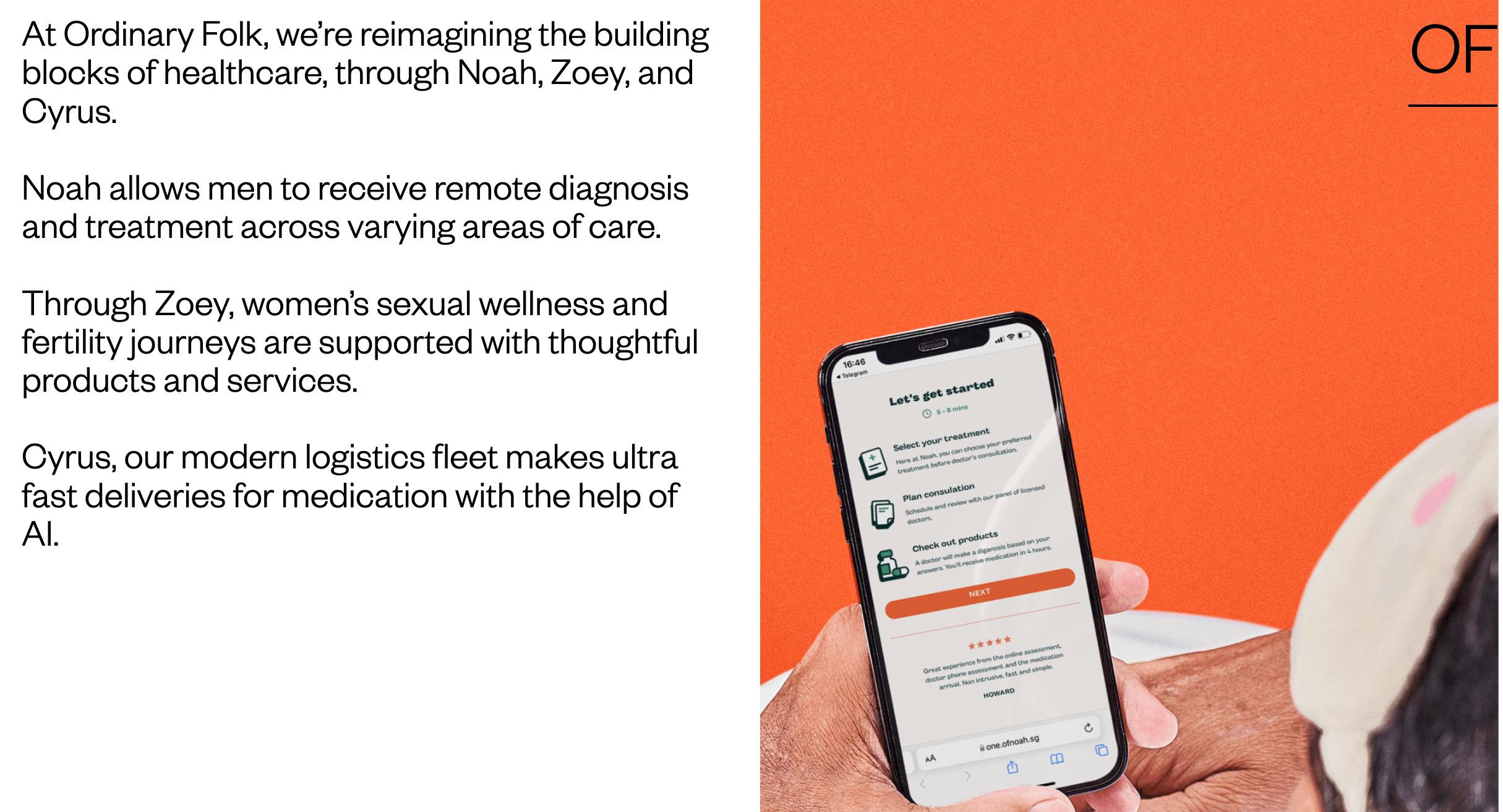 Monk 's Hill Ventures联合创始人兼管理合伙人Peng T. Ong表示,“亚洲各地有数百万人对一些健康问题有很深的忌讳并很难获得适当的治疗和护理。Ordinary Folk的Noah和Zoey定位独特,通过医疗保健服务的消费者之旅带来价值,创造了一个生态系统,让患者能够接触到医疗专家和产品,以及广泛的治疗选择。”