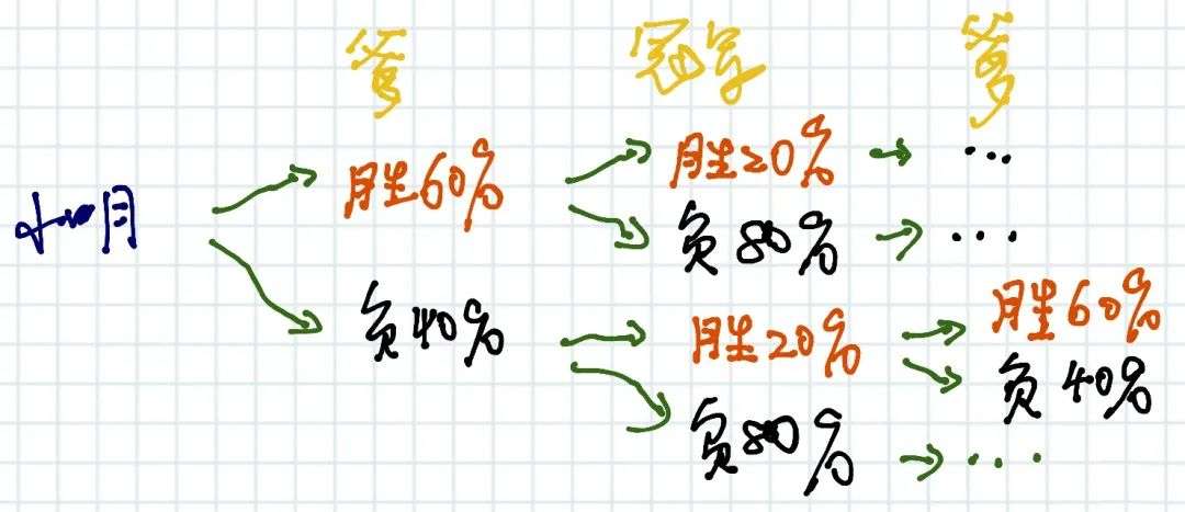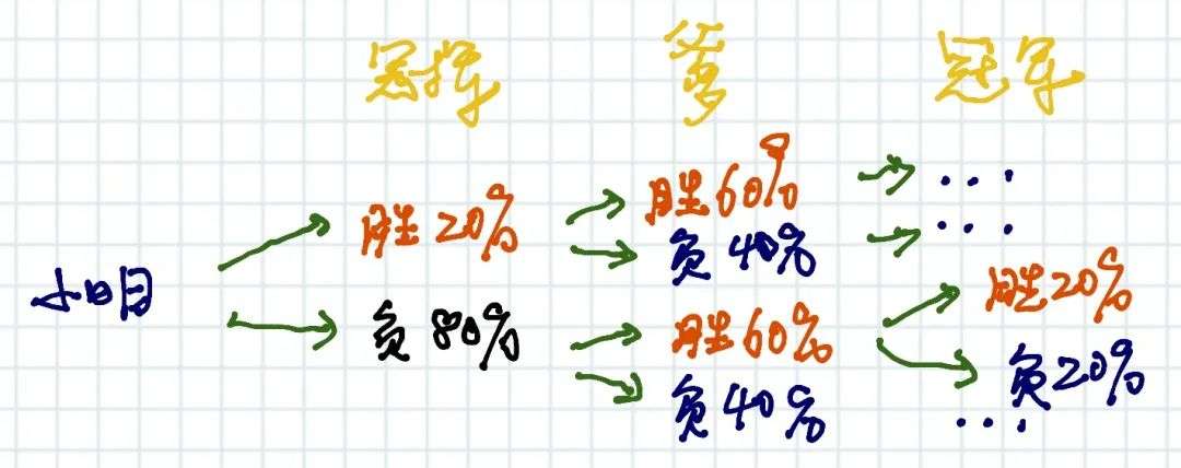 为了更直观,我假设小明对他爹的胜率是60%,对冠军的胜率是20%。