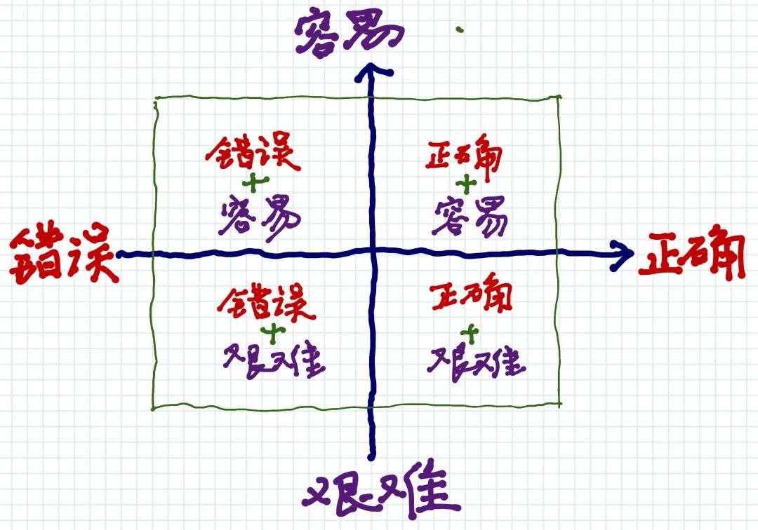 如下图,假如将“正误”作为横坐标,将“难易”作为纵坐标,会得到四个象限: