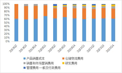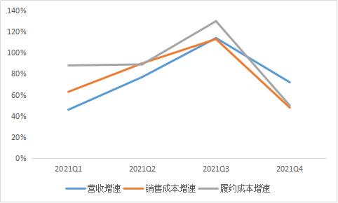以叮咚买菜为例,拆分成本费用项目,履约成本(仓储物流费用)是除产品销售成本以外的最大支出项,2021年Q1-Q4,仓储物流费用在营业支出中的占比接近30%,占营收比重接近40%。从增速来看,2021年Q1-Q4,叮咚买菜的履约成本上涨速度远远超过同期营收扩张及销售成本的增速。