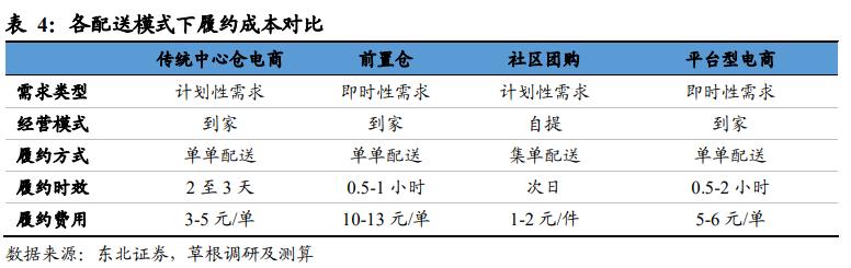 而在上述“快”的优势背后,则隐藏着这种重资产、劳动密集型产业的问题,即租金、配送费等履约成本的持续高企。如图所示,根据东北证券研报数据,前置仓模式的履约费用高达10-13元/单,是传统中心仓电商的3倍左右、平台型电商的2倍左右、社区团购的6倍左右。