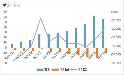 不过,疫情影响所带来的业绩改善并不稳定,当疫情得到有效控制,短期激增的需求回落,叮咚买菜的业绩或许又将“重回原点”。参考疫情爆发的2020年,如图所示,在疫情最严重的Q1,叮咚买菜营收增速超400%,单季仅亏损2亿元,但该季度过后,其营收增速持续下滑,亏损率继续扩大。