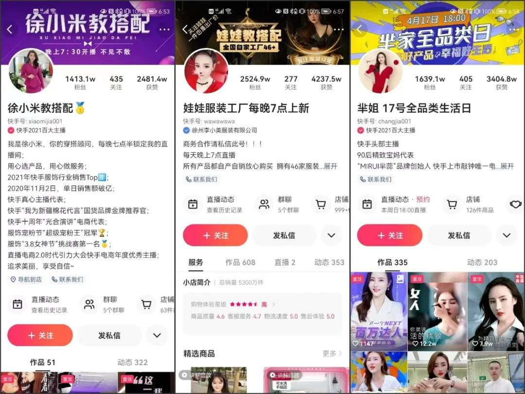 徐小米、娃娃、芈姐的快手账号截图
