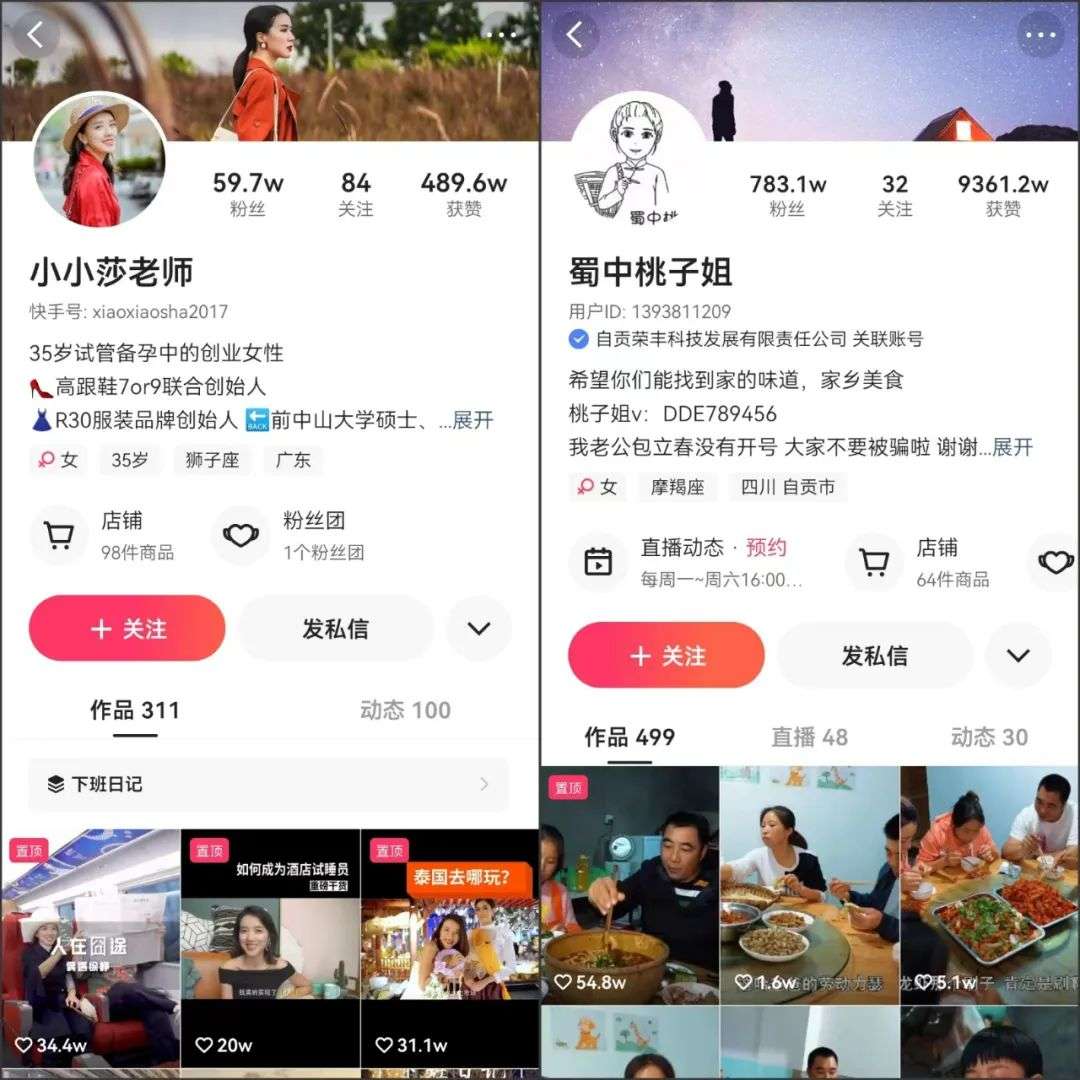小小莎老师、蜀中桃子姐抖音账号截图