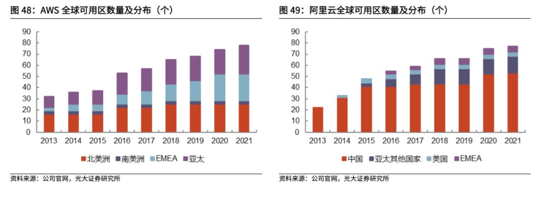 从可用区分布来看,AWS在云计算市场更为发达的北美洲和欧洲地区分别有25/24个可用区,而阿里云分别仅有4/5个可用区,其中阿里云等国内云厂商的节点主要分布在亚太地区。