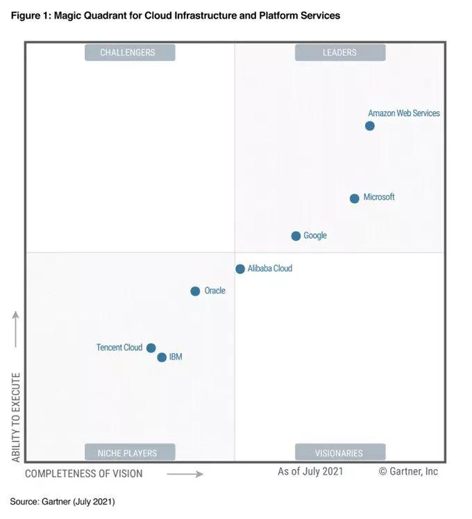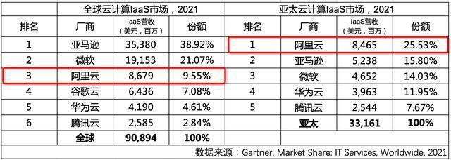 与此对应的是,今年4月15日,在国际研究机构Gartner发布《2021年全球云计算IaaS市场份额数据》显示: