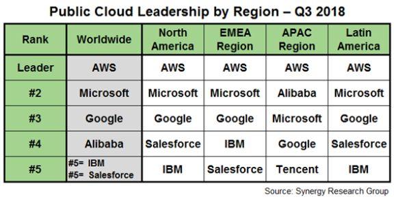 从上图可以看出,在全球主要四大区域的三个区域中,都是亚马逊AWS、微软和谷歌排名前三。只有在亚太区,由于中国市场的影响力,阿里云排名第二,腾讯云排名第五。