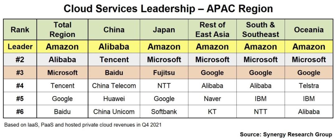 这里再参考国际研究机构Synergy Research Group最新的2021年第四季度数据,在亚太地区的IaaS和PaaS市场中,根据季度收入,亚马逊AWS、阿里巴巴和微软是亚太地区云市场的明显领导者。