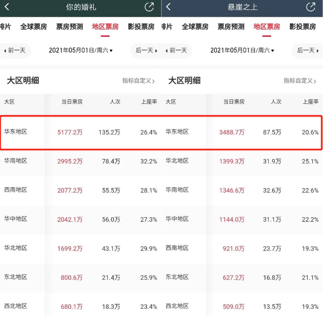 不止如此,从以往票房产出的大趋势来说,2021年五一档,《你的婚礼》《悬崖之上》两部影片背后,华东地区都是产出票房的核心地区,以两部影片在5月1日的票房来说,当日华东地区的观影人次都超出其他地区50万人次以上,这一趋势在其他影片的票房构成中亦有体现。可以说,华东地区一直是支撑大盘的主力地区之一。