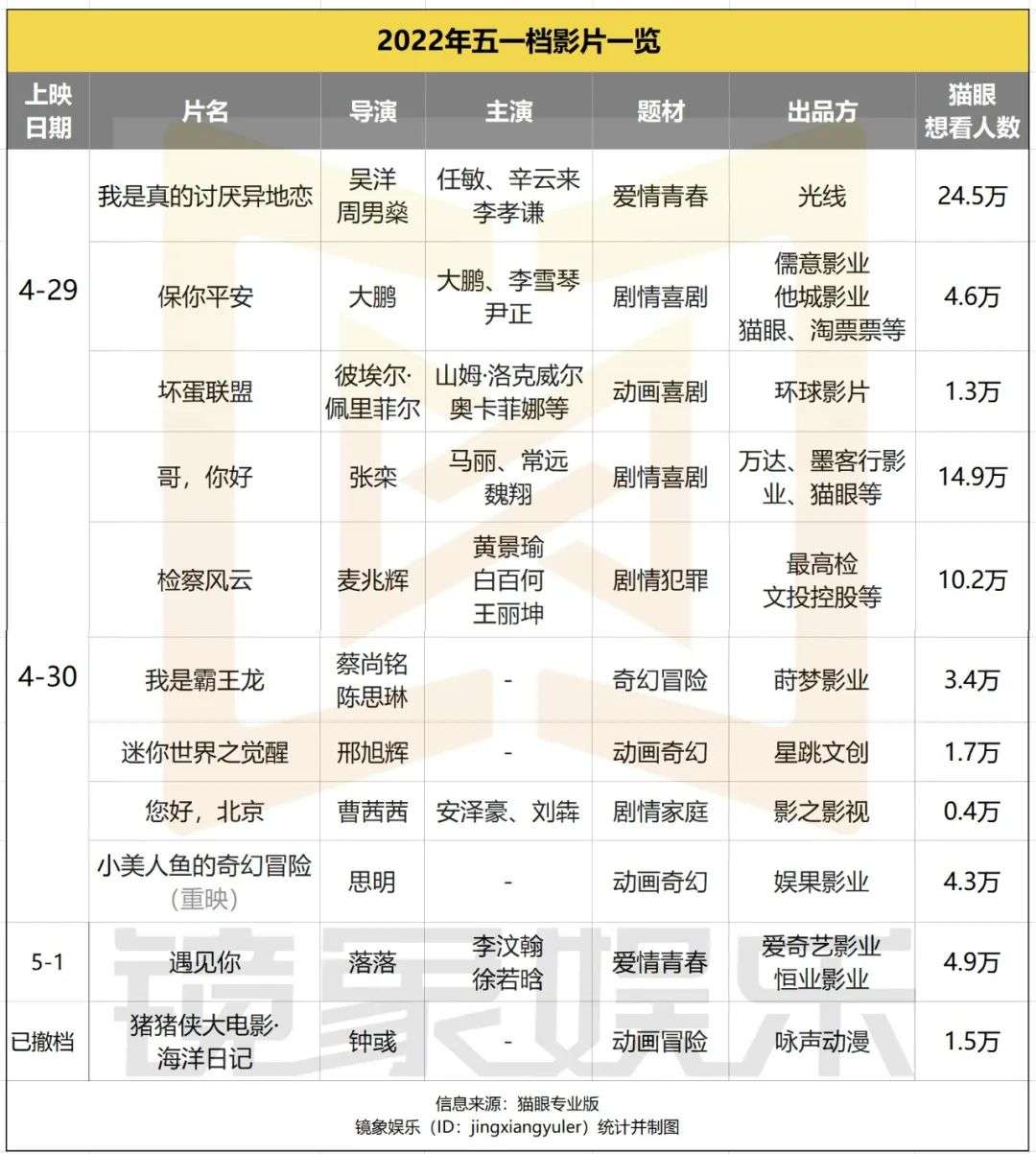 然而,从今年的定档影片来看,猫眼想看人数排在前三位的《我是真的讨厌异地恋》《哥,你好》《检察风云》体量都不大。