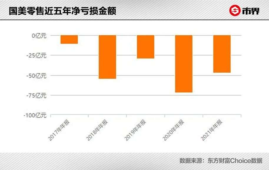 2021年,国美零售实现营收464.84亿元,仅同比增长5.36%,净亏损为47.7亿元,归母净亏损44.02亿元。这意味着, 从2017年起的短短5年,国美零售已累计亏损215亿元,甚至远超其当前市值 。此外,国美的负债总额虽有所下滑,但仍达到633亿元,而有息借款总额则为282亿元。