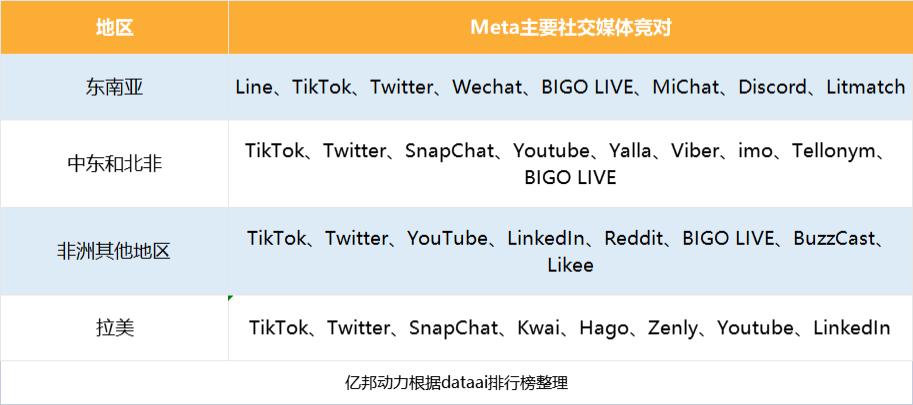 在中东和北非,Meta的竞争对手包括短视频应用TikTok、图文社交媒体Twitter、阅后即焚社交媒体SnapChat、视频媒体Youtube、语音社交媒体Yalla、通讯应用Viber,以及视频/直播应用BIGO LIVE等。