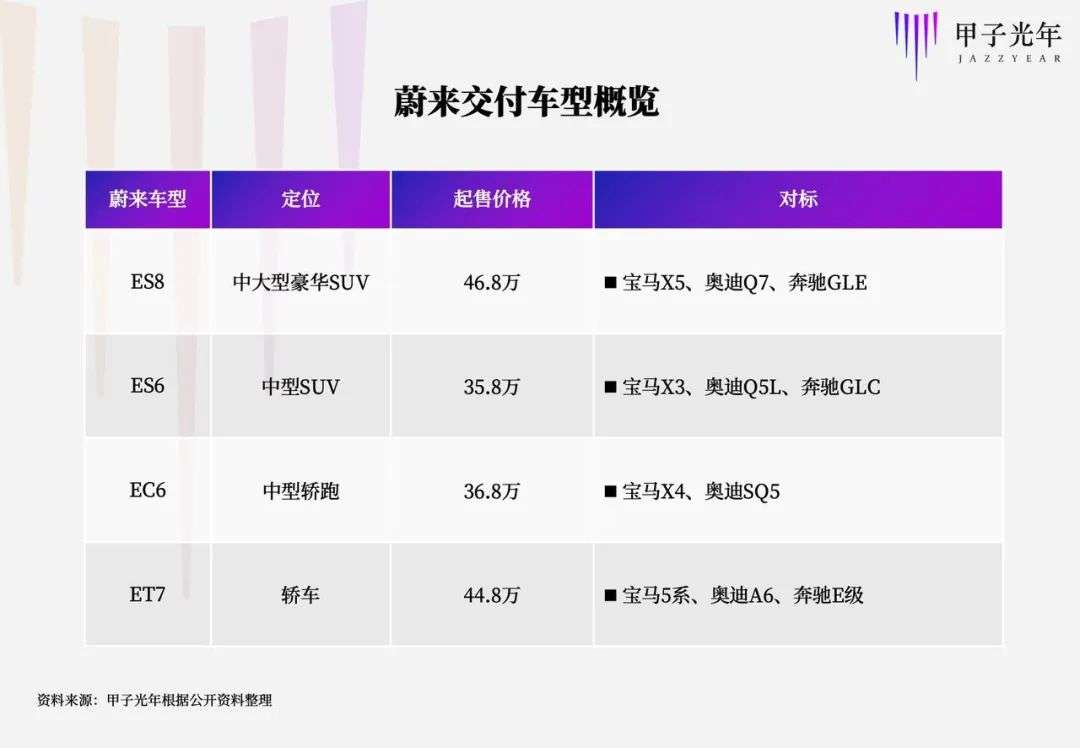 目前蔚来面向市场交付的车型有四款,分别是ES8、ES6、EC6、ET7。2017年,蔚来首款量产车型ES8正式发布,ES8属于中大型豪华SUV,起售价46.8万元,直接对标宝马X5、奥迪Q7、奔驰GLE。2018年,蔚来中型SUV——ES6上市,当前起售价为35.8万元,与宝马X3、奥迪Q5L、奔驰GLC对标。2019年深圳NIO Day上,蔚来发布中型轿跑SUV——EC6,起售价36.8万元,对标宝马X4、奥迪SQ5。2020年NIO Day上亮相的ET7轿车,起售价44.8万元,对标宝马5系、奥迪A6、奔驰E级,已于今年3月28日开始了缓慢交付。
