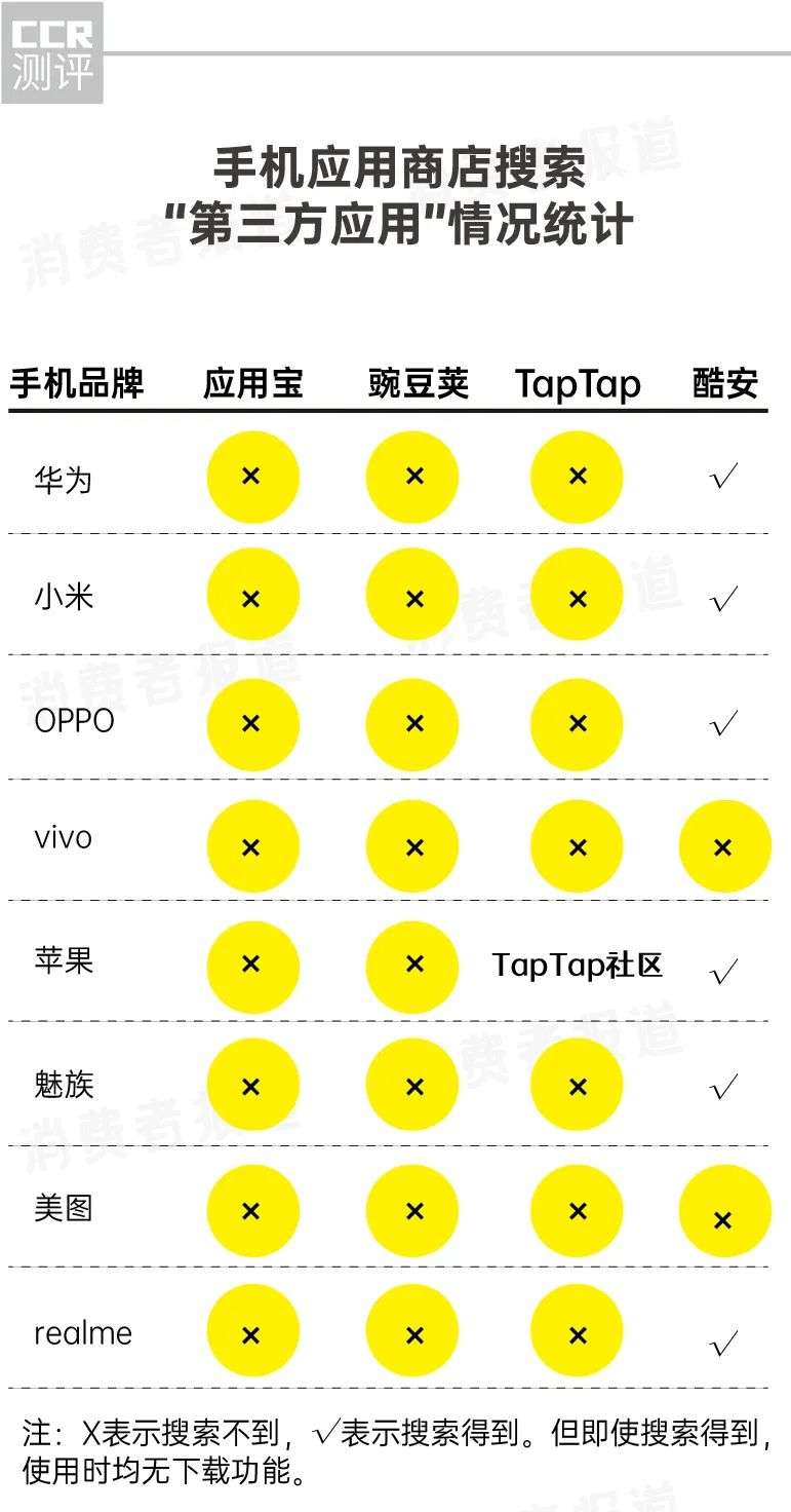 2022年3月,消费者报道发布《 3·15重磅|手机厂商筑起APP的“垄断”高墙:用户下载选择权“名存实亡”》,对多款手机厂商针对4种第三方应用商店(应用宝、豌豆荚、TapTap、酷安)的搜索、下载、安装等进行全面评测试验。
