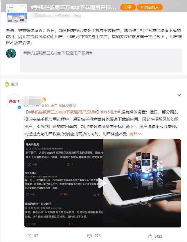 今年315期间,微博话题#手机拦截第三方app下载遭用户投诉#冲上热搜,阅读量高达3000多万,可见并非个例。