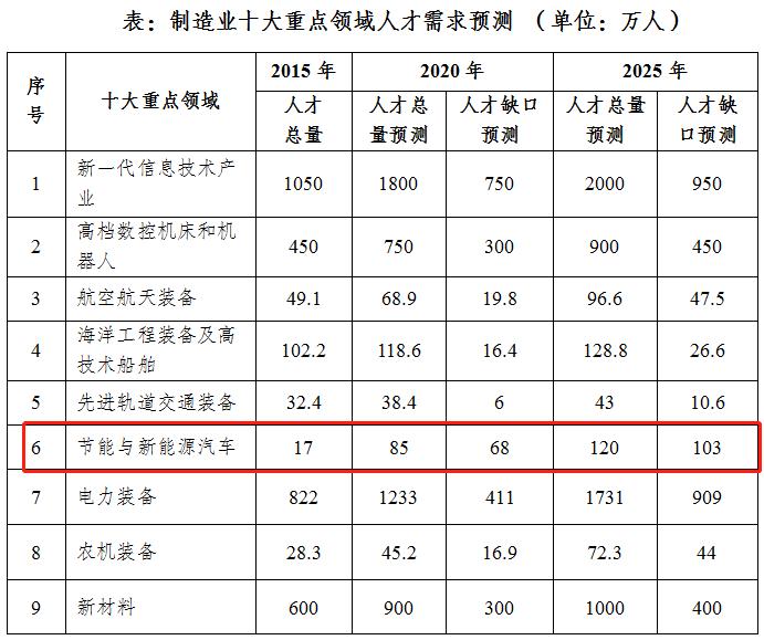尽管燃油机并没有被“判死刑”,但是资本、市场、人才却往往会自动转向有更高回报的行业。根据教育部、人力资源和社会保障部、工业和信息化部联合印发的《制造业人才发展规划指南》预测,至2025年,节能与新能源汽车行业人才需求达到120万人,人才缺口高达103万人。