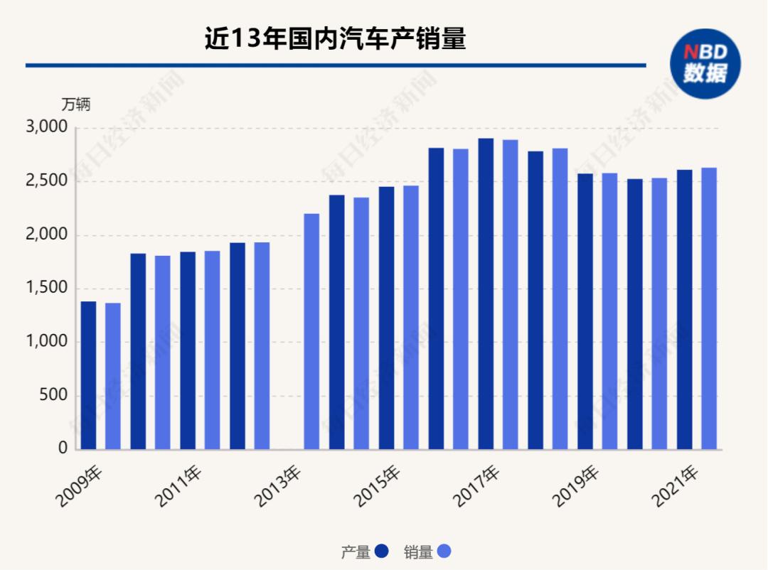 2021年,我国汽车产销分别完成2608.2万辆和2627.5万辆,连续13年保持全球汽车产销量第一,我国作为世界第一汽车市场大国的地位进一步巩固。[5]