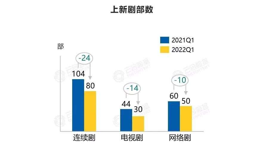 据云合数据,今年一季度上新国产连续剧80部,同比减少24部,优爱腾芒四家平台的上新数均有所减少,是自2020年至今第三年持续走低。
