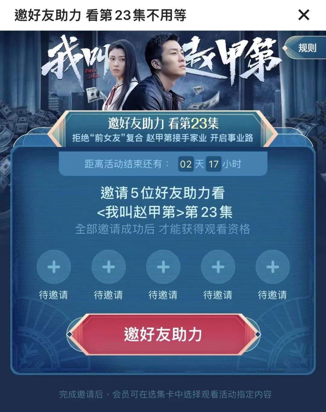 听起来有些猎奇。在好奇心的驱使下,毒眸(ID:DomoreDumou)打开优酷,研究了本次活动后发现,事实至少并不像热搜词呈现的那样夸张:按照3月31日发布的《我叫赵甲第》官方“追剧日历”,4月20号VIP可以观看到23、24集的更新,这一点一直没变,“额外需求”也没有指向既有会员利益的损失。