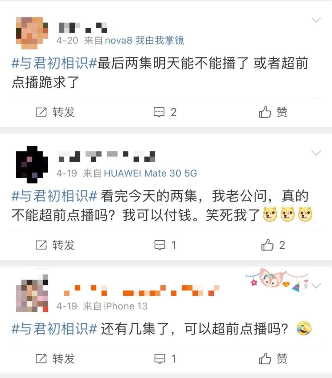 还是以优酷平台为例,在另一部热播剧《与君初相识》的更新过程当中,优酷官博、剧集官博的评论下,也有许多“不满”的声音:只不过,这些声音,反而是催促优酷“加更”,也就是说,用户的观剧需求没有被满足。