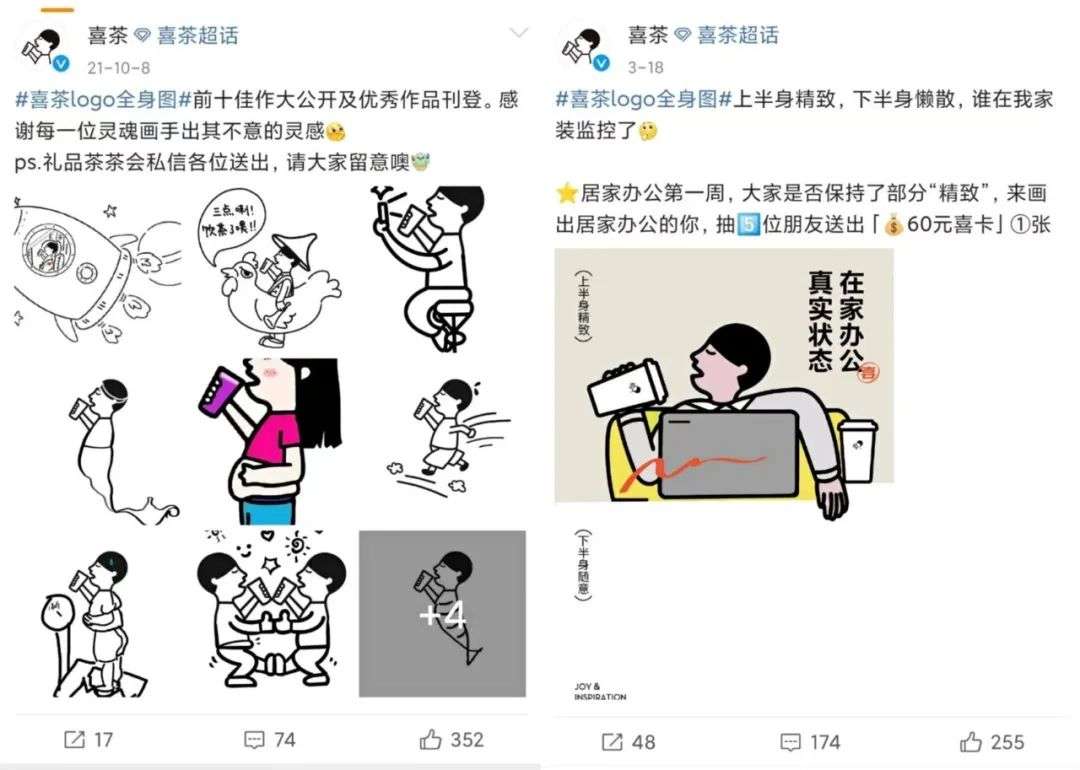 喜茶曾带领网友用喝茶小人玩了一小波二度创作:“喜茶logo全身图”,坐在火箭上喝茶、站在体重秤上喝茶,阿拉丁神灯喝茶小人,喜茶logo在社交平台生风靡一时。