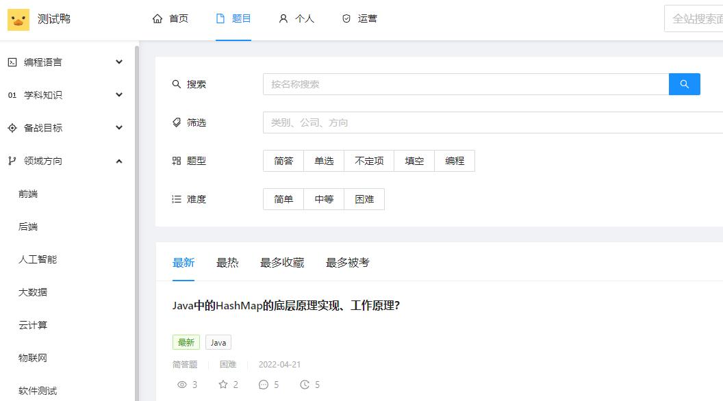 鱼皮建立了一个面试刷题网站,叫「测试鸭」,初心纯粹——为了帮助广大程序员面试。