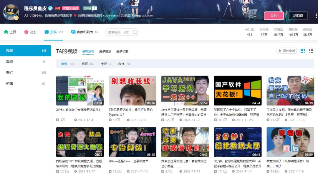 比如,在 B 站,你也许就见过这位叫「程序员鱼皮」的 UP 主,他常常发一些代码教学的视频,引领新人入坑。