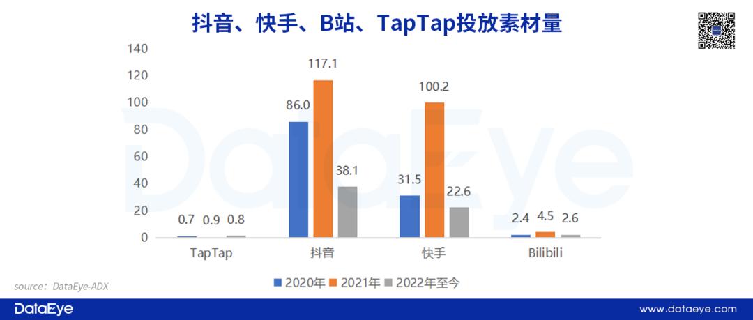 从投放素材总量来看,TapTap与抖音、快手两大短视频平台相差悬殊,与B站也存在不小差距。
