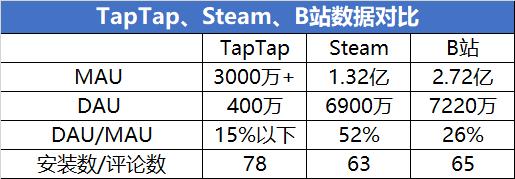 从用户活跃度来看,无论比较“DAU/MAU”还是“安装数/评论数”,Steam用户活跃度均最高,B站次之,TapTap最低。