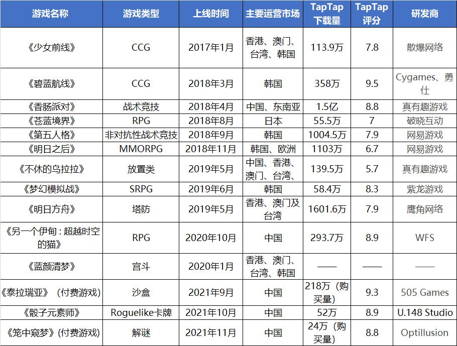 此处我们将重点关注21年以来TapTap独家游戏以及非独家的热门游戏有哪些?这些游戏有何特征?市场表现如何?