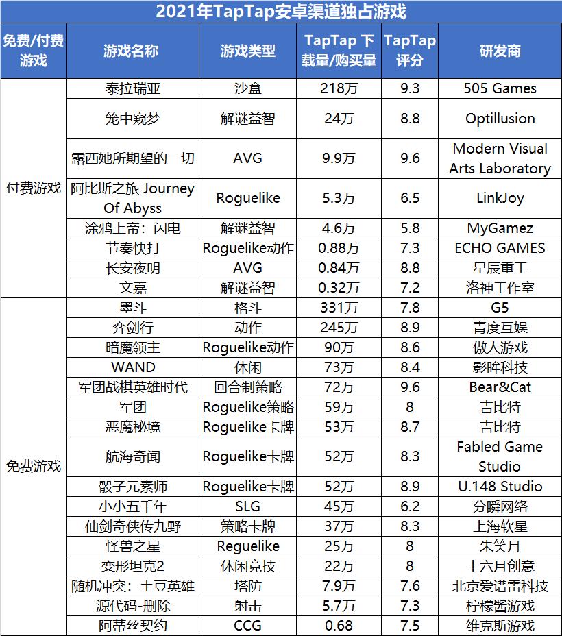 在刚刚过去的2021年,TapTap平台一共上线了24款独占游戏,其中付费游戏8款,免费游戏16款。