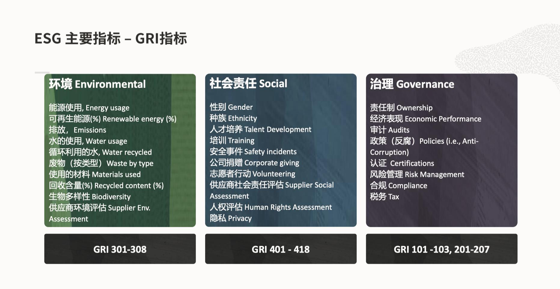 “其实ESG只是一个抽象的概念,在企业内部是不可衡量的,所以企业很难去推动它。我们看到在全球很多想要实现ESG目标的企业,第一件事情是希望它能被量化。有一个全球组织GRI,它做的事情就是专门设计用来衡量ESG里面的发展目标。比如关于环境、能源消耗的情况,整个生产过程中有没有使用清洁能源的比例,产生的材料是不是可回收、可再利用等等,这些都是在E维度下的关键指标。”