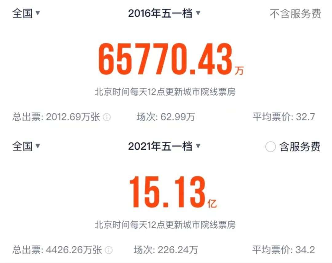 灯塔专业版数据显示,2016年-2021年,中国电影五一档票房从6.57亿元增长到15.13亿元(不含服务费),翻了一倍之多。