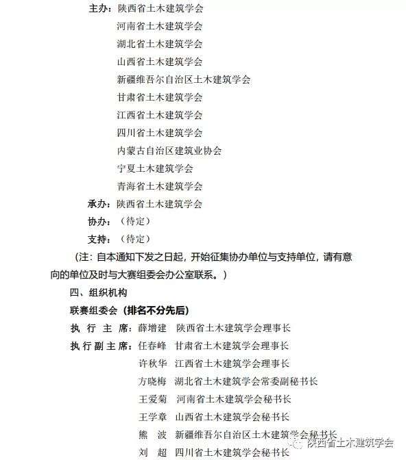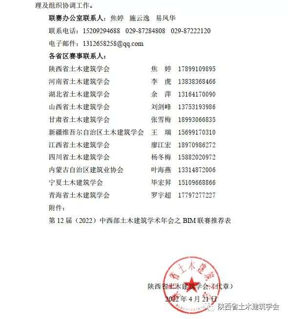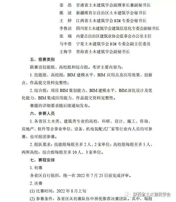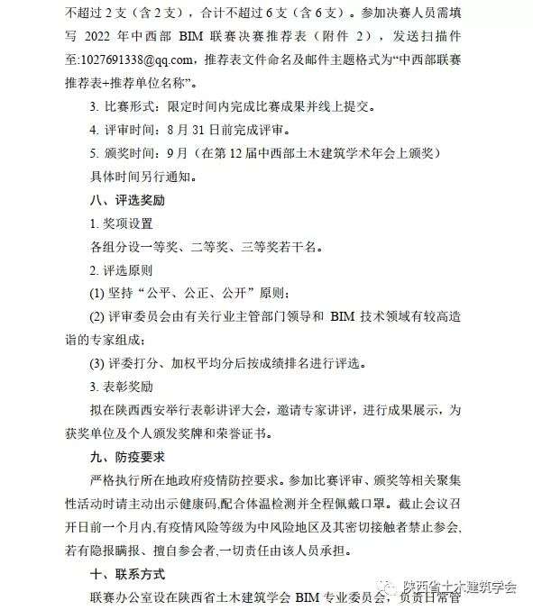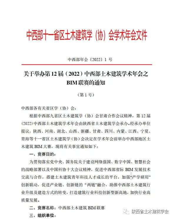 根据中西部九台区土木建筑学(协)会甘肃合作会议精神,第12届 (2022) 中西部士木建筑学术年会由陕西台士木建筑学会承办。经承办单位 提议,陕西、河南、湖北、山西、新疆、甘肃、四川、内蒙、江西、宁夏、 青海等十一台区土木建筑学(协)会决定在学术年会前举办中西部地区士木建筑 BIM大赛,现格有关事宜通知如下: