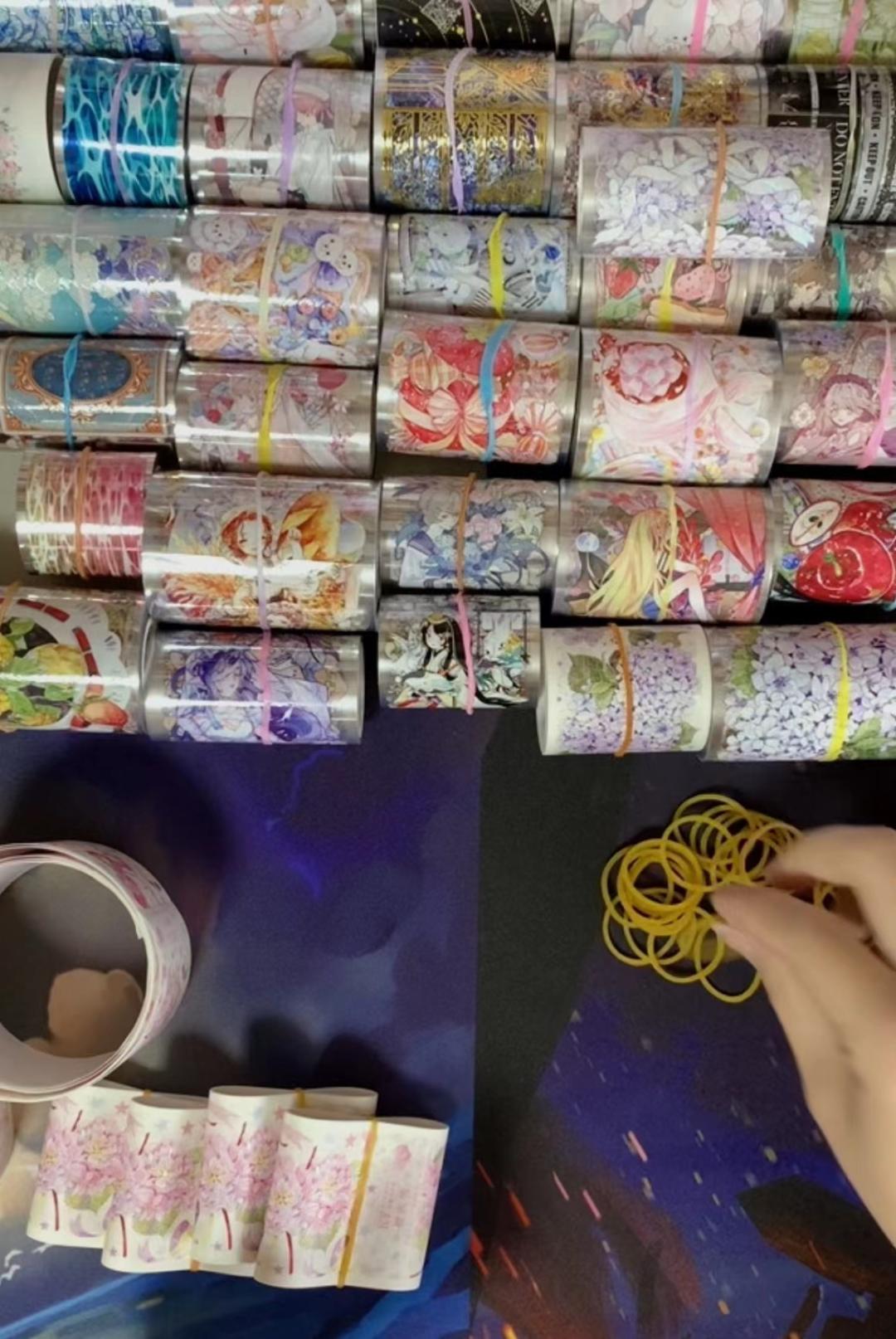 陆产社团胶带多数是固定画手或者形象进行创作,但台产胶带的各环节分工更细致,社团通过约不同画手的稿件,售卖的不同胶带风格会有很大差异。因为以台湾印厂「大年」、「自己印」两家为主,加上疫情的影响,供货周期并不稳定,近两年也有高价陆制印刷厂如康桥、msj等抢占市场。这类胶带整卷价格较高,涨幅也很高,从之前的均价50元/卷到现在的80元/卷,每款胶带会有固定的图案循环,每卷胶带会有1-20个重复循环。这些因素限制了手帐er的入坑门槛,所以相比不断货营业的陆产社团官方店铺,拼贴胶带的店铺经常断货,分装店铺则更为活跃。