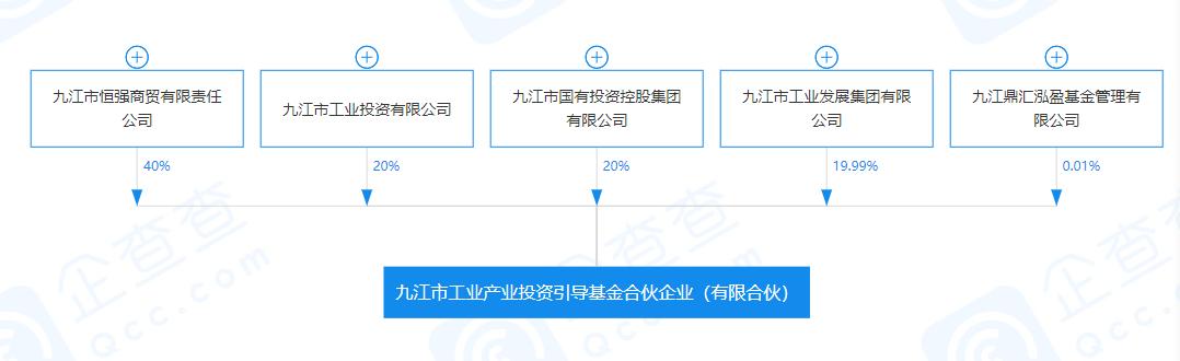 根据九江市国资委网站以及企查查平台信息显示,该基金由九江市恒强商贸有限责任公司分别代表各县、区出资20亿元,占股40%,九江市国有投资控股集团有限公司、九江市工业发展集团有限公司、九江市工业投资有限公司分别出资10亿元,持股20%、20%和19.90%。