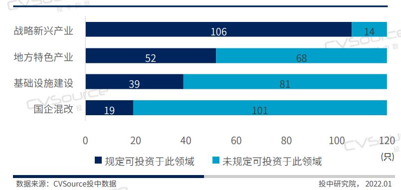 投中研究院发布的《2021年政府引导基金专项研究报告》(以下简称《报告》)显示,各地政府引导基金中,88%明确可投资于战略新兴产业,43%规定可投资于地方特色产业,33%规定可投资于基础设施,16%规定可投资于国企混改。