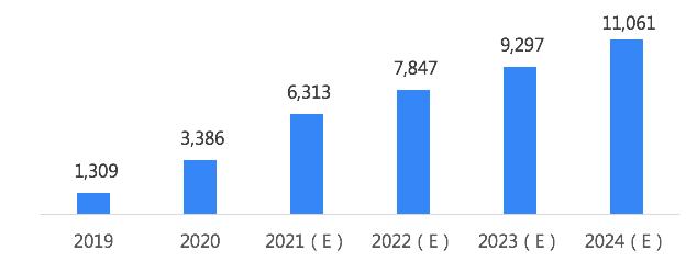 新消费时代,消费触点多元化、消费需求多样化,加之传统中心化平台营销成本持续升高,驱动商家探索更为直接而有效的营销模式,DTC营销应运而生。而各类技术的成熟与物流、支付等基础设施的不断完善,为DTC营销模式的落地应用夯实基础。此外,我国出海商家在竞争日趋激烈的市场环境下,同样开启了去中心化高效营销模式的探索,越来越多的商家拥抱DTC营销,推动行业迎来高速发展。预计2021年到2024年期间,我国DTC营销行业年复合增长率有望达到21%。2024年,行业营收或突破11,000亿元。