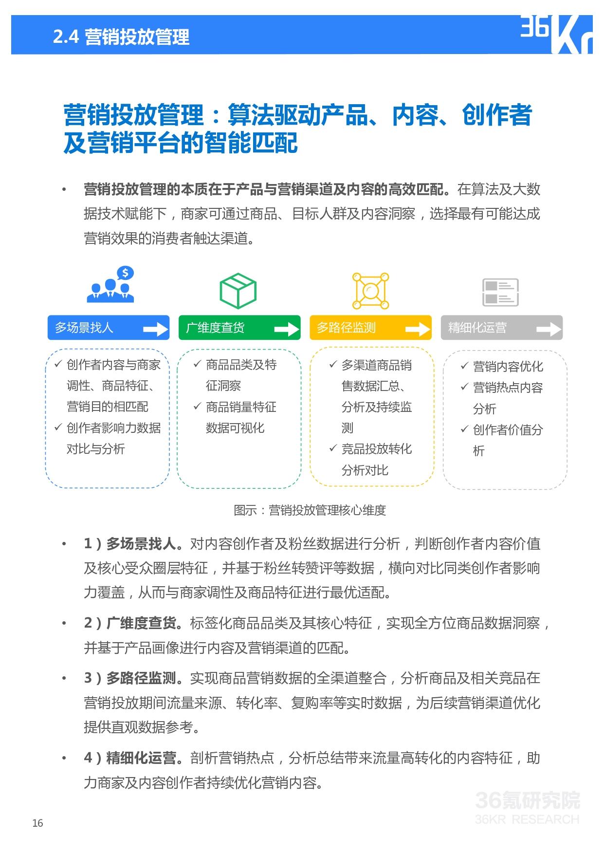 在各技术赋能下,营销前、中、后端各环节均实现优化:前端营销内容、用户行为及产品等各类数据得以整合,为中后期营销投放选择及营销效果管理提供海量数据基础,进而助力商家顺应市场需求并及时进行营销及经营策略的调整,从而持续放大DTC营销效果。