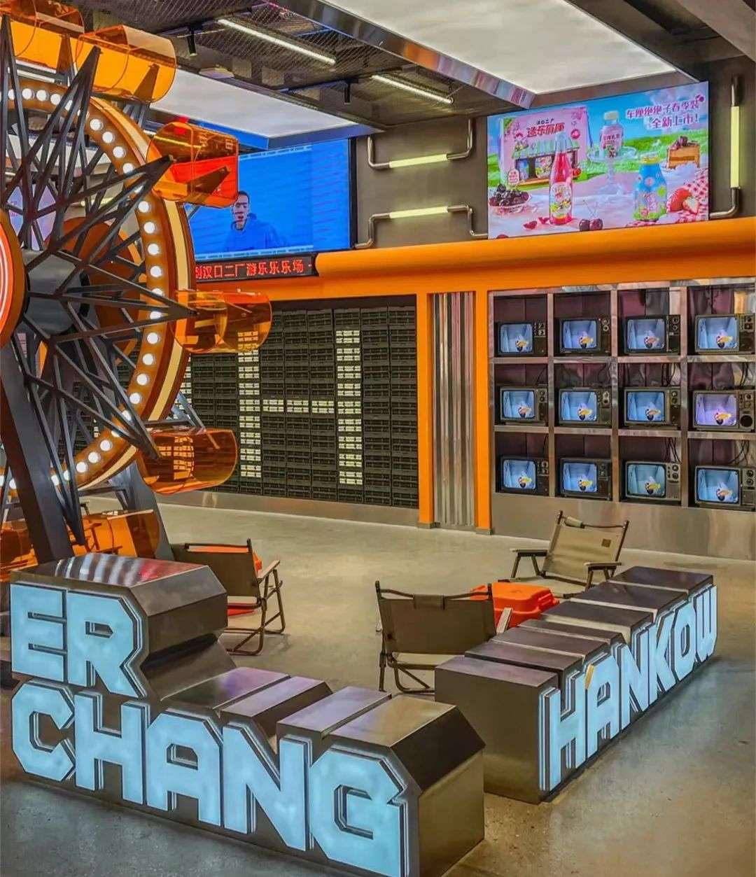 仿真樱花树、摩天轮、许愿板、市集摊位、露营风与工业风混搭的座椅摆设,以及花车上的二厂汽水和摆满汽水的造型墙,每一处都值得打卡拍照。
