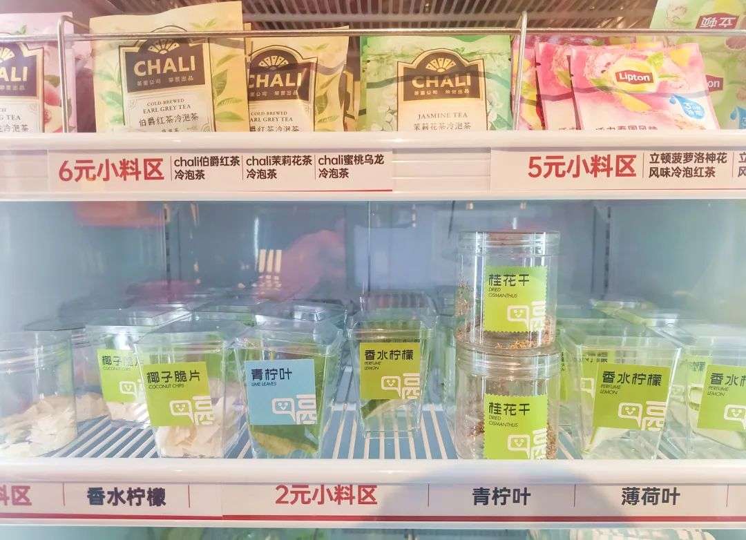 简单来说,就是把柠檬片、桂花干、椰果之类的小料,分装在透明的小盒子里,还有立顿、CHALI的茶包以及MINI装的威士忌等其他品牌的商品。